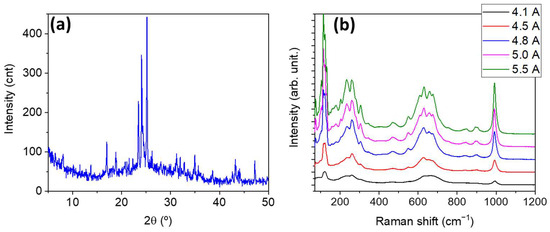Once the growth behavior is determined, we perform XRD and µ-RS measurements in order to assess the type of oxide that is formed. The typical XRD pattern recorded is shown in Figure 9. XRD measurements are performed on the material forming the oxide layer by separating this oxide from the metallic core, giving us information about the main phase of the oxide formed. For all the selected growth conditions where oxide is formed, the diffraction maxima can be associated with the H-Nb2O5 monoclinic phase (ICDD card no. 00-037-1468). This observation is coherent with the measured temperatures during the growth (Table 1). Oxide layer and nanowires appear for currents above 4.1 A, i.e., for temperatures well above 900 °C, which is the condition for forming the H-Nb2O5 phase [5].