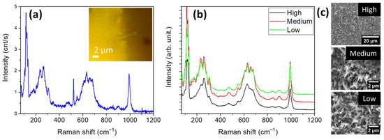 (a) Raman spectrum of individual nanowires protruding from the oxide layer. The peak at 520 cm−1 is related to the silicon substrate. (b) µ-RS variation along the Nb metal wire for 5.5 A and 30 s. (c) Morphology evolution of the nanowires.