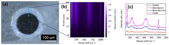 Finally, we study the Raman signal recorded on the cross-section of a Nb wire, to check if there is any modification along the thickness of the oxide layer. The optical section of the metallic wire (Figure 11a) allows us to identify the oxide layer (white in the optical micrograph) and the metallic core (dark blue in the micrograph). The line profile of the evolution of the Raman spectra is shown in Figure 11b. In the graph, the position at which the spectrum is recorded (Y-axis) is presented in terms of Raman shift (X-axis) and intensity of the Raman signal (Z-axis). Similar RS bands are recorded along the thickness of the layer, confirming that the oxide layer is uniform in crystal structure. No signal related to sub-oxides (NbO, NbO2) is detected. Spectra recorded at selected points are presented in Figure 11c. At the center of the metallic core, no RS signal is obtained, as it is a metal without oxidation. On the other hand, the RS signal recorded along the oxide layer shows the same features as on the surface (see Figure 9b). It is at the boundary between the oxide and the metallic core that some changes in the spectra are seen, mainly on the spectrum recorded at the boundary on the side of the metal (‘boundary in’). Even on a region that appears metallic in the optical micrograph, an oxide signal is still detectable, confirming that oxygen is diffusing inside the metal to form new oxide layers.
