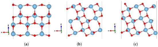 Schematic atomic structure of the anatase TiO2 surface: (a) (001) slab, (b) (101) type A, and (c) (101) type B. Oxygen and titanium atoms are represented by colored balls in red and blue, respectively.