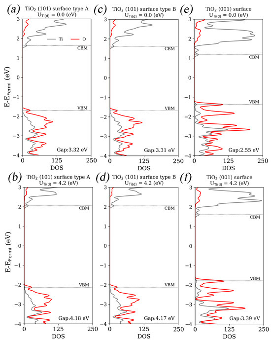 Density of states (DOS) calculated for (a) TiO2 (101) surface type A with eV, (b) TiO2 (101) surface type A with eV, (c) TiO2 (101) surface type B with eV, (d) TiO2 (101) surface type B with eV, (e) TiO2 (001) surface with eV, and (f) TiO2 (001) surface with eV (See Table 1). The lines in red and gray represent the DOS projected onto all orbitals of oxygen and titanium atoms, respectively.