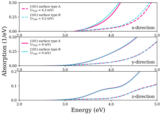 Applying the Hubbard correction to the band gap calculations for pure TiO2 (101) surfaces, both types A and B (Figure 1b,c), affects their absorption spectra, leading to band gap increase. The absorption spectra of pure TiO2 (101) surfaces with and without Hubbard correction are illustrated in Figure 3. When the Hubbard U parameter for titanium d-orbitals eV is incorporated, the resulting optical absorption spectrum shows a red shift compared to neglect of the Hubbard correction. Interestingly, despite these adjustments, our analysis reveals that there is no significant difference in the absorption characteristics between the TiO2 surfaces with and without the Hubbard correction [23,62,63]. This finding suggests that the Hubbard correction does not markedly alter the absorption properties of these surfaces, at least within the range of our study. To ensure a consistent approach in our study, we have opted to calculate the electronic structures of both pure and doped TiO2 surfaces using the Hubbard correction equal to 4.2 eV. This consistency in methodology allows for a more accurate comparison and understanding of the electronic properties across different TiO2 surface configurations.