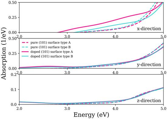 The calculated absorption spectra of pristine and doped TiO2 (101) surface. The dashed (solid) lines are related to the pristine (doped) TiO2 (101) surface; the colors pink and cyan correspond to the absorption for a doped TiO2 (101) surface of types A and B. The top, middle, and bottom panels are related to the x, y, and z directions of the orientations of -kick.