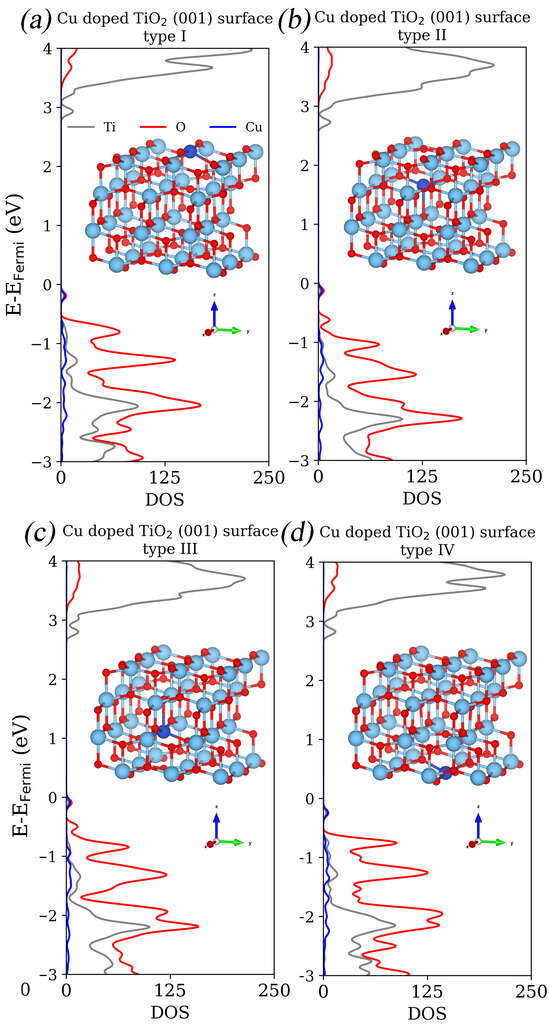 DOS calculated for TiO2 (001) surface type (a) I, (b) II, (c) III, and (d) IV. The lines in red, gray, and blue represent the DOS projected onto all orbitals of oxygen (O), titanium (Ti), and copper (Cu) atoms, respectively. The insets of each figure represent the equilibrium atomic structures of the doped surface. The colored balls in red and blue represent oxygen and titanium atoms, respectively.