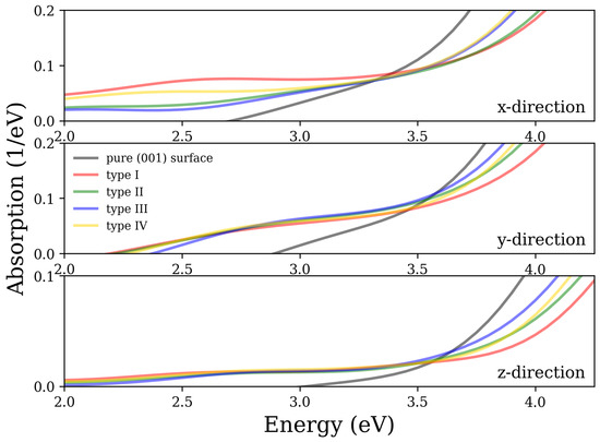 Calculated absorption spectra of pristine and doped TiO2 (001) surfaces. The black lines are the absorption spectrum of a pristine TiO2 (001) surface; the colors red, green, blue, and yellow correspond to the absorption predicted for a doped TiO2 (001) surface of type I, II, III, and IV, respectively. The top, middle, and bottom panels are related to the x, y, and z directions of the orientations of -kick.