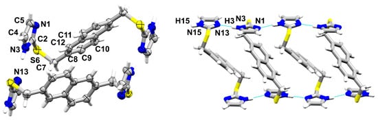 The new ligand 2,6-bis[(imidazol-2-yl)thiomethyl]naphthalene crystallizes in a centrosymmetric space group of a triclinic system with two crystallographically independent halves of the molecules in the asymmetric unit (Figure 1).