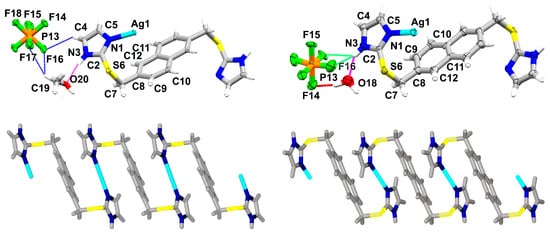 The methanol solvate (1) and the hydrate (2) of {[AgL](PF6)}n crystallize in different crystallographic systems, namely an orthorhombic or a monoclinic system of a Pnma or P2/c space group, respectively. Both compounds (Figure 2) show the presence of half of the ligand molecules, silver ions located in special positions (Ag ions located on inversion centers), counterion and methanol or water molecules located in special positions (mirror plane (1) or 2-fold axis (2)) in the asymmetric unit. The complexes form 1D cationic polymers, in which the Ag ions are coordinated by the N-atoms originating from two symmetry-related molecules of the ligand with an ideal linear geometry (N-Ag-N angle of 180°) (Table 3).