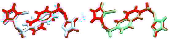 Overlays of fragments of the 1D chains, on the left in 1 (red) and 2 (blue), RMSD = 1.417 Å; on the right in 1 (red) and 3 (green), RMSD = 0.041 Å.