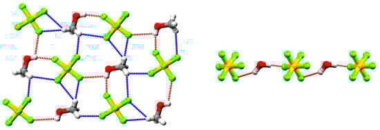 Interestingly, the counterions and methanol molecules in 1 form layers in the ac plane (Figure 4), connected by a net of hydrogen bonds, such as O-H∙∙∙F and C-H∙∙∙F, and interact further with the layers of metal complexes, which consist of columns of 1D chains, via N-H∙∙∙O and C-H∙∙∙F hydrogen bonds. These A,B layers of metal complexes show an alternating orientation in each adjacent layer. In 2, the counterions and water molecules form supramolecular chains via O-H∙∙∙F hydrogen bonds extending along the a-axis, which are further interacting with 1D cationic polymers via N-H∙∙∙O, N-H∙∙∙F, and C-H∙∙∙F (Table 4). The cationic chains are expanding along the same axis and are stacked above each other. Also, in this case, the presence of A,B type of layers of the cationic complex can be observed.