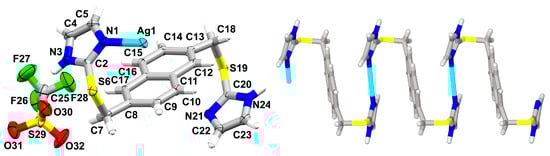 The isolated crystal structure of the silver complex with the triflate counterion crystallizes in a monoclinic system of the Cc space group with one molecule of the ligand, one Ag cation, and one counterion in the asymmetric unit (Figure 5).