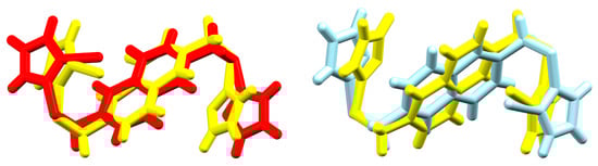 Overlays of fragments of the 1D chains. On the left: 4 (yellow) and 1 (red), RMSD = 0.835 Å. On the right: 4 (yellow) and 2 (blue), RMSD = 1.613 Å.