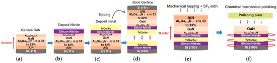 Main process flow of layer transfer technology to fabricate N-polar GaN. (a) Epitaxial Growth (b) Deposition of Nitride (c) Deposition of Metal (d) Bonding Ga-face (e) Mechanical Lapping and SF6 Etching (f) Chemical Mechanical Polishing (CMP).