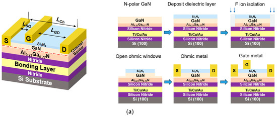 - Chung, J.W.; Piner, E.L.; Palacios, T. N-face GaN/AlGaN HEMTs fabricated through layer transfer technology. IEEE Electron Device Lett. 2008, 30, 113–116. [Google Scholar] [CrossRef]