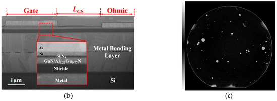 To be specific, the fabrication of the device commenced with the deposition of an Si3N4 diffusion buffer layer onto both the 6-inch Ga-polar AlGaN/GaN structure and the Si (100) substrate (Figure 1b), using low-pressure chemical vapor deposition (LPCVD). A Ti/Cu/Au (50 nm/800 nm/20 nm) stack was subsequently deposited onto both wafers by magnetron sputtering. Thereafter, Au–Au thermo-compressive wafer bonding was employed to bond the Ga-polar GaN wafer onto the Si (100) substrate (Figure 1c). Figure 1d shows the wafer bonding procedure for the Au–Au thermo-compressive wafer bonding of the Ga-polar GaN epiwafer onto the Si(100) carrier wafer. Following the removal of the Si (111) substrate by mechanical lapping and SF6-based dry etching, the N-polar AlN nucleation and AlxGa1−xN barrier were removed by CMP, as illustrated in Figure 1e,f. The specifics are covered in the following text. The schematic and process flow in Figure 2a depict the main manufacturing process of the N-Polar HEMT device, comprising dielectric deposition, F ion implantation for device isolation, ohmic contact fabrication, and gate fabrication, which will be discussed later. Figure 2b shows the FIB-SEM image of the fabricated N-polar HEMT; a clear Si3N4/metal bonding interlayer beneath the GaN/AlGaN heterojunction can be observed. Figure 2c demonstrates the successful bonding of the 6-inch epitaxial wafers with minor defects generated by particles affecting the subsequent substrate thinning process. After the wafer bonding, the original Si (111) substrate of the HEMT structure was thoroughly removed using mechanical lapping and SF6 plasma dry etching (Figure 1d). The wafer was then cut into 1.2 cm × 1.3 cm pieces and cleaned with an organic solvent.