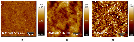 AFM image of (a) N-polar AlN surface after Si substrate removal (RMS = 0.569 nm). (b) N-polar GaN surface exposed by CMP (RMS = 0.216 nm). (c) N-polar GaN exposed by ICP etching (RMS = 1.75 nm).