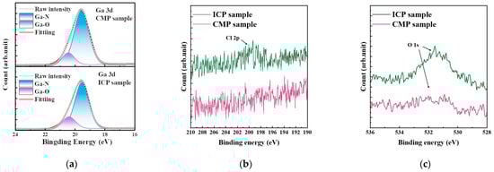 XPS core-level spectrum of (a) Ga 3d, (b) Cl 2p and (c) O 1s for the CMP and ICP samples.
