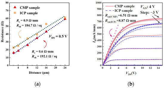 Comparison of (a) transfer line method (TLM) and (b) output characteristics for CMP- and ICP-based MIS-HEMTs.