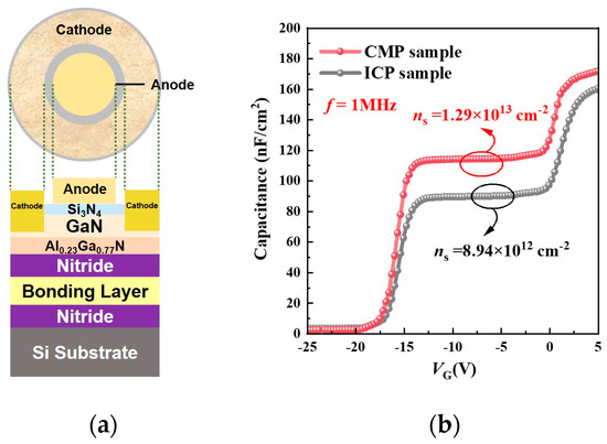 Figure 5b shows the output characteristics of the N-polar MIS-HEMTs fabricated via both CMP and ICP methods. The maximum current in the CMP sample is 756.1 mA/mm at VGS = 4 V, ~11% higher than that of the ICP sample (677.9 mA/mm). The on-resistance (RON) values of CMP and ICP sample are 6.51 Ω·mm and 8.87 Ω·mm, respectively. The improved output characteristics of the CMP sample are mainly due to the reduced deep-level states defects induced by energetic ion bombardment [15]. Notably, it was found that the output curves shown in Figure 5b show negligible self-heating effects, i.e., current drop at the operating conditions of high IDS = 756.1 mA/mm and high VDS = 15 V. The improved thermal dissipation abilities of our device can be attributed to the layers having the worst thermal conductivity, i.e., high-Al-content AlGaN buffers having been totally removed by the CMP/ICP etching process [20]. The remaining structures, i.e., GaN/AlGaN heterojunction, have relatively good thermal conductivity and stability. Figure 6a,b shows the capacitance–voltage (C-V) test structure and measurements of the CMP and ICP samples at 1 MHz. The total 2DEG sheet density, ns, can be obtained with the folowing formula [21]: