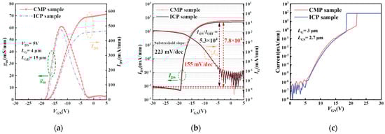 Figure 7a,b compares the transfer characteristics of the device on the CMP and ICP samples. Specifically, at VDS = 5 V and the same pinch-off voltage of −18 V, the CMP sample exhibited a transconductance of 61.1 mS/mm, surpassing that of the ICP sample (57.9 mS/mm). The CMP sample demonstrated an ION/IOFF ratio of 7.8 × 104, with a subthreshold slope (SS) of 155 mV/dec, while the ICP sample exhibited an ION/IOFF ratio of 5.3 × 104, with a SS of 233 mV/dec. This largely reduced SS value of the CMP sample further confirms the improved surface conditions of the N-polar GaN surface prepared via CMP methods [20].