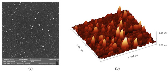 SEM and AFM micrographs of the thin film samples S1–S4 show all a similar surface topology character containing frequent spherical surface irregularities (bulges) with a characteristic dimension in the range of hundreds of nanometers (the results obtained for sample S2 are shown in Figure 2a,b as an example). The presence of bulges can be suppressed by the fine-tuning of the IJD acceleration voltage and the target-to-substrate distance.