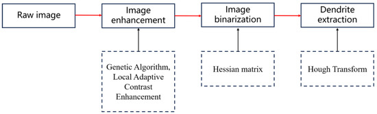 To address the above problems, a dendrite extraction method based on the Hough transform [37] is proposed in this paper. The flowchart of the algorithm is shown in Figure 2, which mainly includes three steps: image contrast enhancement [38], image binarization based on a Hessian matrix [39], and dendrite extraction. The advantages of the proposed method are as follows: