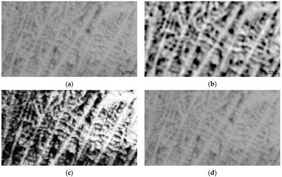 The optimal gain factor coefficients were obtained via the genetic algorithm, and the optimal gain factor coefficients were substituted into the ACE algorithm to enhance the dendritic images; the image enhancement results are shown in Figure 3b. The results of the genetic algorithm-based local contrast enhancement algorithm proposed in this paper are compared with the commonly used histogram equalization method and Laplace enhancement method for image enhancement, and the results are shown in Figure 3c,d. It can be seen from Figure 3 that the histogram equalization method and the Laplace enhancement method can enhance the dendrite image, but the information about the part of the dendrite is lost after enhancement, which directly affects the result of subsequent dendrite detection. The contrast of the images enhanced using the method in this paper is significantly increased, and dendritic features are more visually apparent. The proposed method overcomes the unstable processing effect caused by the traditional ACE algorithm with a fixed gain coefficient, increasing the grayscale difference between the dendrite region and the interdendritic region, enhancing the image details and improving the image quality. To evaluate the quality of the augmented images, the evaluation function is defined as follows: