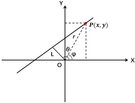 Each set of parameters (the distance from the origin of the coordinates to the line) and (the angle between the vertical line and the horizontal axis of the right-angle coordinate system) in the equation determines a straight line, and that line is unique. It can be seen that a straight line in the Cartesian coordinate system transforms to a point in the polar coordinate system, so a two-dimensional counter can be designed to count the parameters in polar coordinates, and the maximum value of the counter can be found as the straight line in the image.