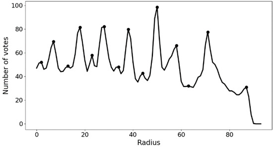 The results of the primary dendrites extracted according to the method in Section 2.2 contain many wrong and duplicated line segments, and, therefore, their results need to be optimized. According to the solidification principle, columnar crystals have a strong orientation and are represented in the image as primary dendrites parallel to each other. Therefore, the data with the highest number of votes under each radius in the Hough transform voting results were taken out separately, and the results are shown in Figure 6. Since a primary dendrite can be seen as the longest line segment on the image, the line segment at the peak position in Figure 6 has the highest probability of being a primary dendrite.