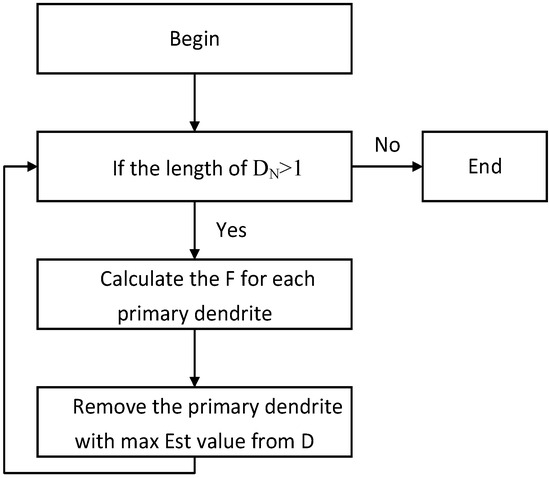 The evaluation function consists of the residuals of the least squares method and the projection error. The smaller the evaluation function, the better the extracted primary dendritic results. Here, is the true value of the coordinates, is the predicted value based on , and is the total amount of data. is the projection error of the line segments in each dendrite, which is obtained by projecting the line segments belonging to each dendrite onto a line in the direction of the dendrite and calculating the projection distance of the adjacent line segments. The principle of removing erroneous dendrite line segments is defined as follows: we calculated the value of the evaluation function for each dendrite according to (17), removed the dendrite with the largest evaluation function value in turn, and recalculated the value of the evaluation function for each dendrite until only one dendrite remained in . The flow chart of the algorithm is shown in Figure 8.