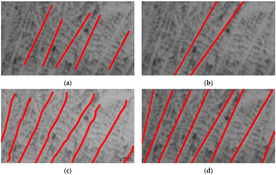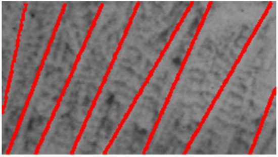 Taking the data of the peaks in Figure 6, is the number of peaks and is regarded as dendrites, so is the set of dendrites. The lines detected at the peak of Figure 6 are shown in Figure 7, where it can be seen that there are a number of error lines in the image that need to be removed. Based on the notion that primary dendrites are parallel to each other, all primary dendrites in the image can be regarded as a set of parallel straight lines, and for any point on the i-th dendrite, there is the following relationship: