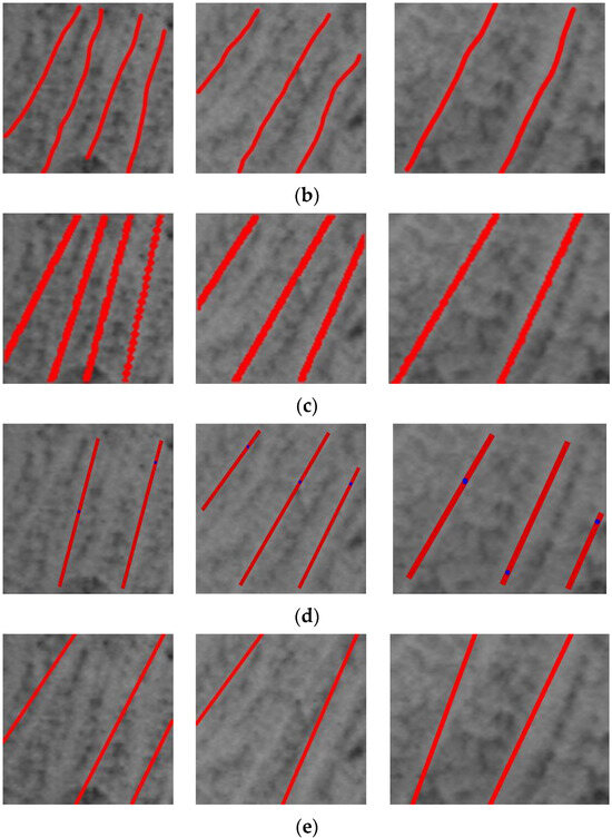 Dendrite detection results for different dendrite images: (a) original dendrite image; (b) manual labeling results; (c) the proposed method; (d) the method of reference [19]; (e) the method of reference [36].