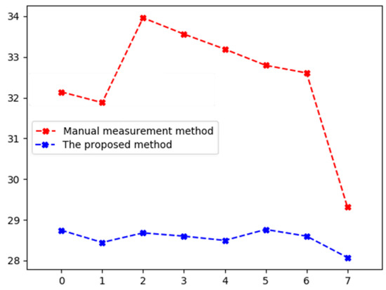 The primary dendrite spacing measurement method is drawing several vertical primary dendrite straight lines, and the distance between the line and the primary dendrite intersection point is the primary dendrite spacing, as shown in Figure 12. We measure the dendrite spacing of the dendrites detected via the proposed method and the manually extracted dendrites. We take eight different positions for measurement and take the average value, as shown in Figure 13. The red is the measurement result of manually extracted dendrites, and the blue is the measurement result of automatically detected dendrites via the proposed method. From Figure 13, it can be seen that the measurement result of the manual method fluctuates greatly, and the result is unstable, which is closely related to the experience and working time of the detection personnel. The measurement result of the proposed method is smoother and more stable. Primary dendrite spacing is the average value of the measured values at different positions. The PDAS of the manual measurement is 32 pixels, and the PDAS measured via the proposed method is 28 pixels. According to the dendrite image, the average width of the primary dendrite in the image studied in this paper is 10 pixels. Compared with the manual method, the error of this method is four pixels. This error is within the acceptable range, which proves the effectiveness of this method at detecting dendrites. This paper overlooks the problem of determining the center point of the primary dendrite, as identifying the center of the dendrite is a challenge [44]. The center point of the primary dendrite is the intersection of the centerline of the primary dendrite and the centerline of the secondary dendrite. The subject of this paper is the dendritic images of continuous cast slabs, which have complex compositions that lead to poor quality dendritic images and ambiguous information about secondary dendrites. Therefore, further research will be conducted on the characteristics of the secondary dendrite information to provide more accurate information for measuring the dendrite spacing.