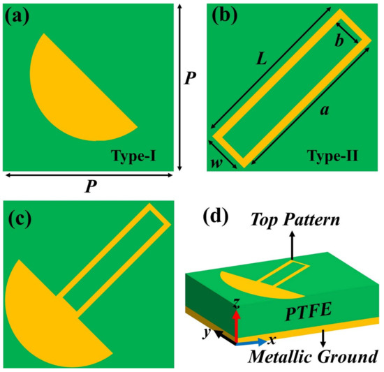 The evaluation process for the proposed meta-atom: (a) semicircle (type I); (b) slotted rectangular patch (type II); (c) the proposed meta-atom; (d) schematic diagram of the proposed meta-atom (green represents substrate and yellow indicates the metallic patch).