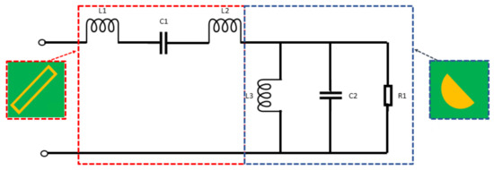 Figure 1 depicts the two evaluation processes for the meta-atom. In the evolution stage of the meta-atom, the semicircle patch structure (type I) is depicted in Figure 1a. In step 2, the slotted rectangular patch (type II) is shown in Figure 1b. Finally, the proposed meta-atom is constituted by combining a slotted rectangular patch with a semicircle, as shown in Figure 1c. The schematic figure of the proposed meta-atom is illustrated in Figure 1d. The equivalent LC circuit of the slotted rectangular patch combined with a semicircle is shown in Figure 2. The red dotted box shows the equivalent circuit of the slotted rectangular patch and the blue dotted box indicates the equivalent circuit of the semicircle. The optimized dimensions of the proposed meta-atom are tabulated in Table 1.