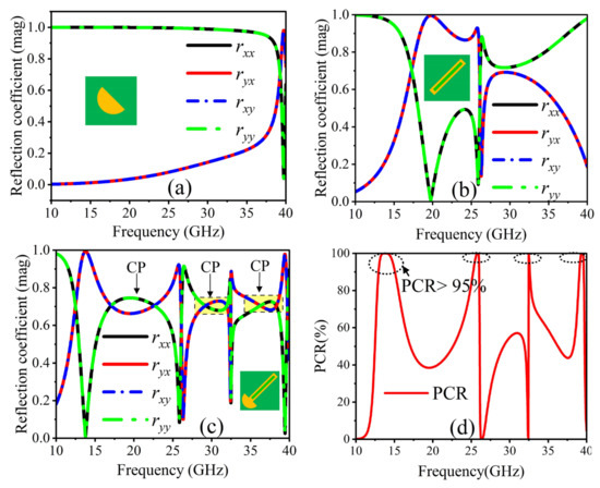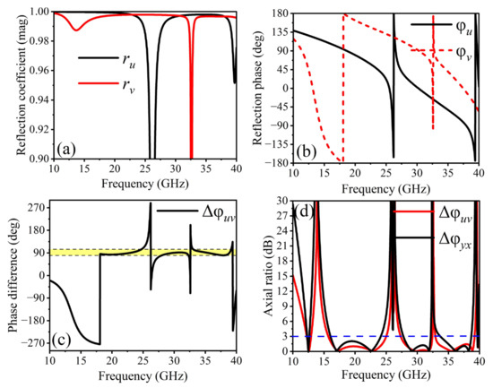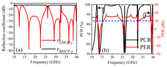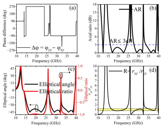 Additionally, Figure 4c demonstrates that the elliptical angle is approximately in three frequency ranges, namely 16.78–23.14, 28.84–32.02, and 35.04–38.46 GHz, and the elliptical angle is close to in two frequency ranges, 12.46 and 39.76 GHz, demonstrating that the reflected polarized waves are RHCP and LHCP, respectively. Figure 4d shows that the reflection components and have nearly the same magnitude for the frequencies 12.46, 16.88–23.11, 26.1–32.44, 34.97–38.49, and 39.75 GHz, where yellow area represents that the ratio of co-and cross-polarization are nearly equal to 1. There are several bands between 10 and 40 GHz where circular polarization is satisfied. It is worth mentioning that the five frequency bands offer near-ideal CP conversion. These ideal characteristics are attributed to the negligible loss in the substrate, equal power distribution, and (or an odd integral multiple of ) phase difference between the two orthogonal reflection components. Now, we express two LP–CP reflection coefficients and , PCR and PER [17], as the following equations: