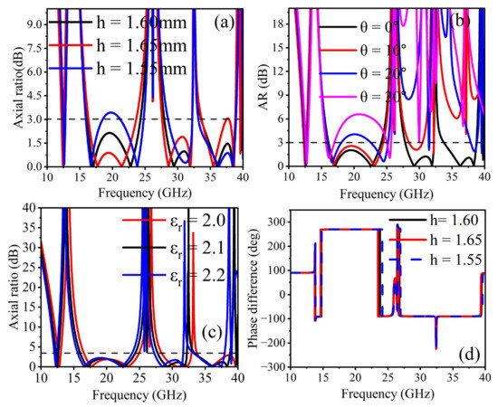 The simulated results for the parametric variations: (black dashed line indicates 3 dB line) (a) AR (h = 1.55, 16.0, 1.65 mm); (b) incident angle to ; (c) material properties ( = 2.0, 2.1 and 2.2); (d) phase difference (h = 1.55, 1.60, 1.65 mm).