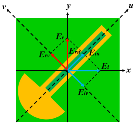 An electric field is denoted by . Moreover, ‘’ and ‘’ denote the incident and reflected EM wave, respectively. The polarization conversion ratio (PCR) can be employed to evaluate the CPC performance of a meta-atom. The PCR for an incident wave with linear polarization can be calculated using the following formulas [37]: