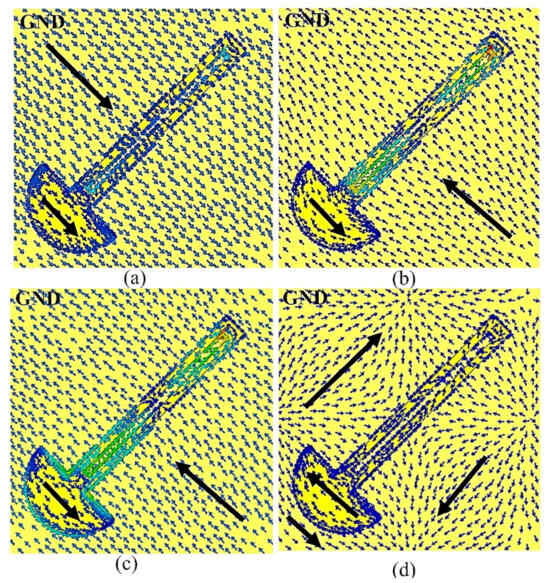 where Equation (12) represents a CP reflected wave. Figure 8a,b display the amplitude of the reflection coefficients, and the reflection phase curves of the proposed metasurface for the - and -polarized incidence waves, whereas Figure 8c shows the phase difference curve. In the distinct frequency ranges of 10.09–11.83, 16.34–23.90, 28.87–31.72, and 33.68–38.69 GHz, as anticipated, , and the phase difference is approximately . It satisfies the above-analyzed Equation (11) and accomplishes the conversion of the -polarized wave into the -polarized wave, or CPC. The conversion from an LP wave to a CP wave is achieved in the distinct frequency ranges of 10.01–11.59, 15.33–25.15, 27.18–32.15, and 33.03–38.56 GHz; where , the phase difference is approximately an odd integral multiple of 90°, as shown in Figure 8c. Finally, the AR of the reflected wave is calculated from the above data following the phase difference obtained in Figure 8c, and the resulting findings are displayed in Figure 8d. The derived AR essentially agrees with one of the phase differences , as shown in Figure 8d. By using the surface current distribution, the conversion mechanism is evaluated. Figure 9 displays the surface current distribution on the top and bottom layers in response to u and v components at resonance frequencies of 13.59, 26.16, 32.59, and 39.70 GHz. These can be magnetic resonances or electric resonances from the proposed converter. Furthermore, magnetic resonance happens when a current flows in the opposite direction through the bottom and top metallic plates. Figure 9b–d demonstrates that the surface currents at the top of the layer are anti-parallel to the surface currents at the bottom, at the three resonance frequencies 26.16, 32.59, and 39.70 GHz. The surface current density at the top and bottom are parallel at 13.59 GHz. This indicates an electric resonance at 13.59 GHz, as seen in Figure 9a. Table 2 provides a detailed evaluation of the proposed design in comparison to recently reported single-layer converters.