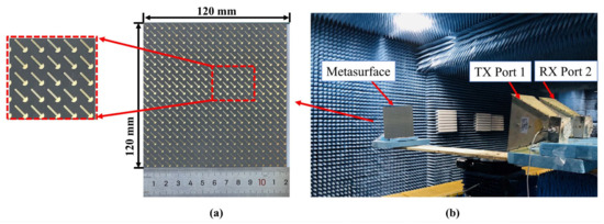 We fabricated the metasurface and measured it to verify the simulated results. Figure 10a illustrates the fabrication of 20 × 20 elements totaling 120 × 120 mm2 to practically verify the attributes of the proposed metasurface. Metallic copper designs are etched onto the thin layer of PTFE (), using printing circuit technology. The metal layer has a thickness of 0.035 mm, whereas the PTFE layer has a thickness of 1.6 mm. A metallic copper plate is used on the back side of the substrate to achieve complete reflection. As shown in Figure 10b, the experiments are performed in an anechoic chamber to eliminate reflections and background noise, for accurate results. With the aid of two different sets of LP horn antennas, the reflected waves in two frequency sweeps (8–18 GHz and 18–40 GHz) are measured. These horn antennas are associated with the Agilent vector network analyzer N5230.