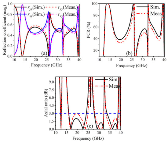 The measured and simulated results: (a) co- and cross-polarization conversion, (b) PCR (%); (c) axial ratio (dB) (blue line indicates the 3dB axial ratio line).