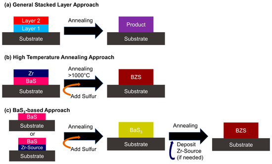 In this work, we further elaborate on our stacked layer approach for the synthesis of BZS thin films as previously presented [49]. In the stacked layer approach, multiple precursor layers are deposited onto the substrate and subsequently annealed, as can be seen in Figure 1a. We first demonstrate the possibility to produce BZS films in this fashion in a high temperature (>1000 °C) process as shown in Figure 1b. The second proposed route utilizes BaS3, which is fabricated by sulfurizing BaS film. As can be seen in Figure 1c, the Zirconium source can either be deposited before the BaS deposition or after the sulfurization step to form BaS3. In both cases, a final annealing step is needed to complete the BZS synthesis. The BaS3 films previously described showed numerous defects, which could be detrimental for the synthesis of BZS films and their performance in optoelectronic applications [49]. In this work, we improve the microstructure of the BaS3 films and drastically reduce the synthesis time and temperature. These results might prove crucial in the continuous development of this approach in future research.