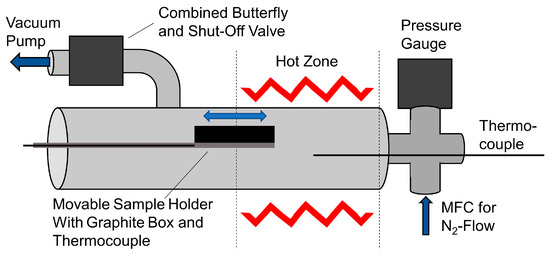 Sulfurization of the other samples was conducted in a modified tube furnace. Figure 2 illustrates the setup schematically. Compared to our previous setup, [49]. several upgrades were made to allow for automated control of the pressure and gas flow besides the control of the temperature. With these changes, the lowest vacuum achievable was reduced from about 1 mbar into the range of 10−2 mbar. The setup is now equipped with a butterfly valve (Pfeiffer, Asslar, Germany) combined with a shut of valve (Pfeiffer) and a pressure gauge (Pfeiffer) to control the pressure. A mass flow controller (MFC) (Bronkhorst, Kamen, Germany) is used to control the nitrogen (5.0, Lindner) flow, which was generally maintained at 100 sccm. The sample is placed in a graphite box alongside a measured amount of sulfur powder (99.5%, 100 mesh, Alfa Aesar). The box is then placed on a movable sample holder, which also contains a thermocouple to measure the sample temperature. Two additional thermocouples are placed within the heating elements of the tube furnace for temperature control purposes, while a third is placed in the center of the oven itself. The whole setup is controlled using a computer utilizing an in-house made software based on TwinCat (Version v2.11.2308.0). The parameters controlled and measured in the setup are pressure, gas flow and temperature. The annealing time is controlled by manually moving the sample in and out of the hot zone. The annealing parameters are summarized in Table 2. Set Temperature refers to the temperature the oven was set to regulate to. The actual temperature within the oven generally slightly varied throughout the experiment. The Annealing Time refers to the time between moving the sample inside the Hot Zone and moving it out again.