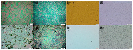 Comparison of microscope images of previously fabricated BaS3 samples ((a–d), reused with permission from [49]) and BaS3 samples fabricated as part of this study (e–h). The microstructures of Samples 2 (a), 3 (b) and 4 (c,d) have larger defects and bulges than Samples 5 (e), 6 (f), 7 (g) and 8 (h). The different colors in (e–h) are not accurate to reality and are caused by differences in the white balance.