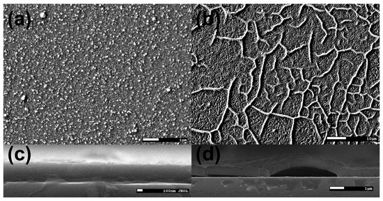 SEM images of Sample 10 (a,c) and Sample 9 (b,d) showing the surface of BaS and BaS3 films, respectively, in top (a,b) and cross-sectional (c,d) view.