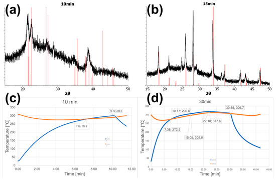 During the annealing experiments, the temperatures of the sample and the inside of the oven were recorded. For samples annealed for 10 and 30 min, the resulting temperature curves are displayed in Figure 6c,d. From these curves, the temperature needed to obtain BaS3 can be determined. After 10 min of annealing the sample in the oven set to 300 °C, the sample almost reaches 300 °C. After 15 min of annealing, the sample reaches 305 °C. In the remaining 15 min of annealing, the sample and oven temperature initially continue to rise, before they fall again. At the end of the 30 min anneal, roughly 305 °C is achieved again. The rise above the oven set temperature of 300 °C is due to the oven regulation setup. After the initial cooldown, the software initiates the oven the heat up to compensate. Due to the slow heating of the oven, heating above the desired temperature is unavoidable. To obtain BaS3, either a slightly higher temperature compared to obtaining BaS2 is needed, and/or a slightly longer annealing time. To test these hypotheses, experiments using a comparatively hot preheated oven (660 °C) were conducted. In those experiments, the sample was extracted from the oven upon reaching about 300 °C. The XRD pattern for sample 16 is displayed in Figure 7 alongside its temperature curve during the annealing. Figure A3 shows the same data for three samples processed in a similar fashion, differing only slightly in the time they remained in the hot zone. For sample 16, this was done after 1:30 min, but the temperature continued to rise until it reached its maximum at 2 min of 422.3 °C. This trend was observed for the other three samples similarly (Figure A3b–d). Because of this, the annealing time between the four samples were varied slightly. Based on the XRD data, samples 17 and 18 showed the presence of small amounts of BaS2.