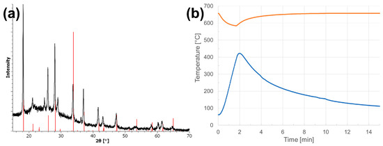 (a) XRD spectrum of Sample 16 annealed in rapid thermal processing, showing good match with the BaS3 reference pattern (red lines). (b) Temperature curve for the same sample (blue line) showing the rise in temperature up to 420 °C even after exertion of the sample after 1:30 min. The oven temperature (orange line) was set to 660 °C and only slightly drops during the process.