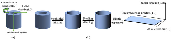 Most of the research studies the texture of the tube by testing the longitudinal- and cross-section [32]. When the grain orientation of the alloy tube is preferentially distributed along the radial direction, the grains are arranged in a circular outward radial arrangement, and it is difficult to measure the texture directly. Therefore, an expansion method was conducted to prepare the electron backscattered diffraction (EBSD) samples, as shown in Figure 1. The intermediate ring of the tube with a thickness of 0.5 mm was obtained by mechanical thinning first, and then it was thinned to less than 0.1 mm by pickling. The EBSD sample of the circumferential plane of the tube with a size of 7 × 5 mm was obtained after cutting and elastic expansion. The radial, circumferential, and axial directions of the tube were determined as the RD, TD, and ND of the sample, respectively. The specimen surfaces were grounded on a series of SiC papers and subsequently electrochemically polished using a solution of 5 vol% HClO4 + 95 vol% CH3COOH. The microstructure and texture of the circumferential plane for the tube were characterized by EBSD techniques at a step size of 0.3 μm using a JEOL JSM-7900F equipped with TSL OIM Analysis 8 software.