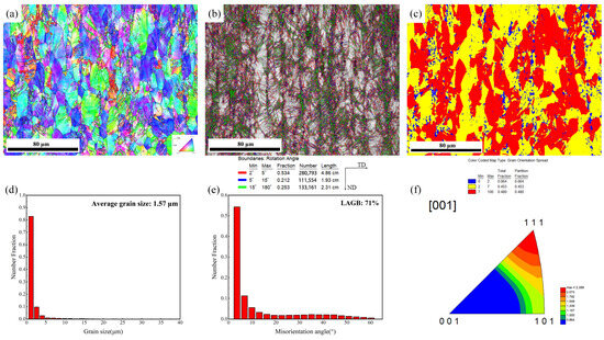 Microstructure of cold-rolled alloy tube: (a) inverse pole figure (IPF); (b) image quality figures with LAGBs and HAGBs; (c) grain orientation spread (GOS) map; (d) average grain size chart; (e) misorientation angle chart; (f) inverse pole figure along radial direction.