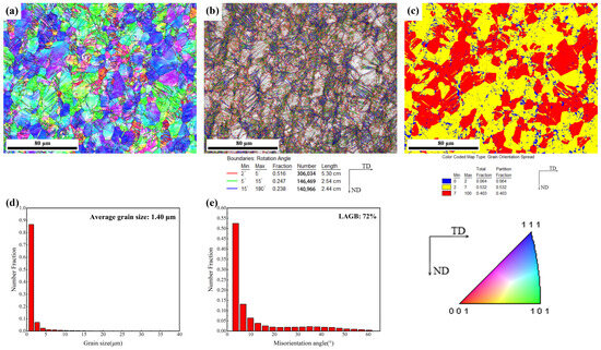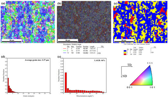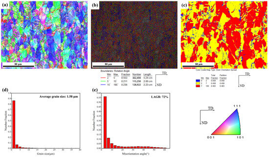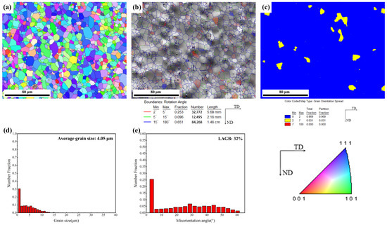Microstructure of alloy tube annealed at 450 °C/60 min/AC: (a) inverse pole figure (IPF); (b) image quality (IQ) figure with LAGBs and HAGBs; (c) grain orientation spread (GOS) figure; (d) average grain size chart; (e) misorientation angle distribution chart.