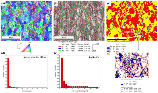 Microstructure of alloy tube annealed at 550 °C/60 min/AC: (a) inverse pole figure (IPF); (b) image quality (IQ) figure with LAGBs and HAGBs; (c) grain orientation spread (GOS) figure; (d) average grain size chart; (e) misorientation angle distribution chart; (f) region 1 in (c).